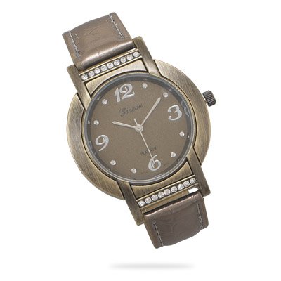 Bronze fashion watch with a 40mm watch face and 16mm band. The watch face has clear swarovski crystal accents. Fashion watches are base metal.
